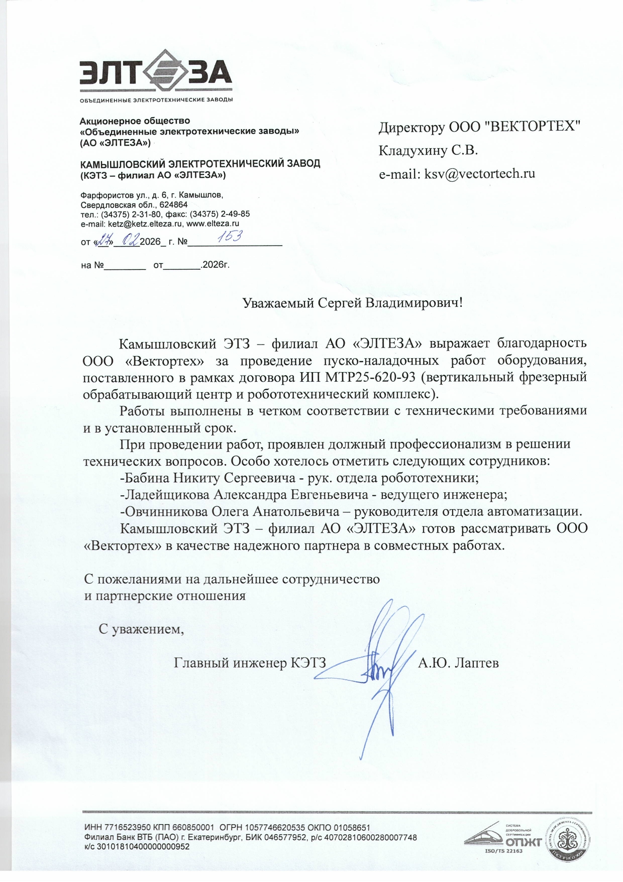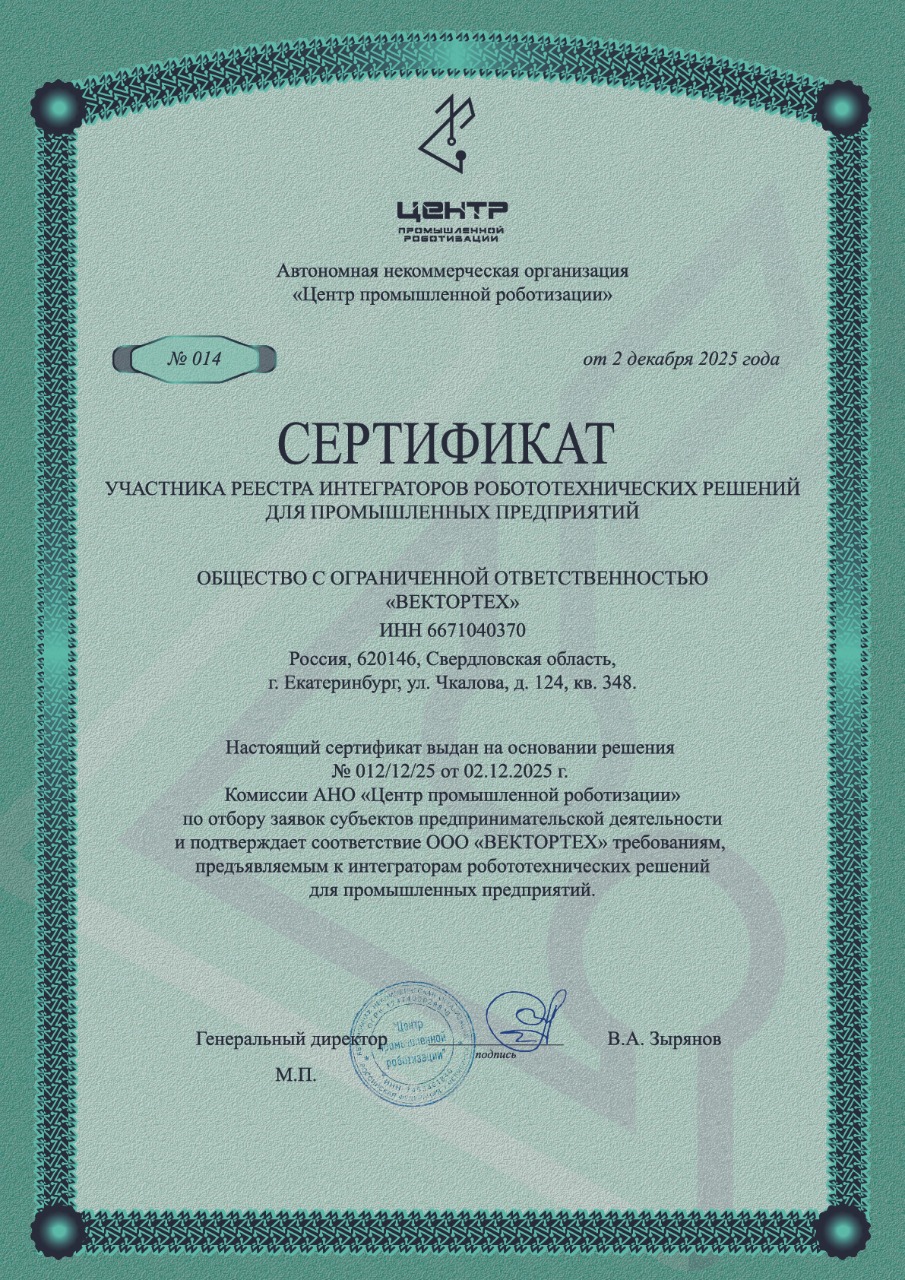 Сертификат участника реестра интеграторов робототехнических решений для промышленных предприятий
