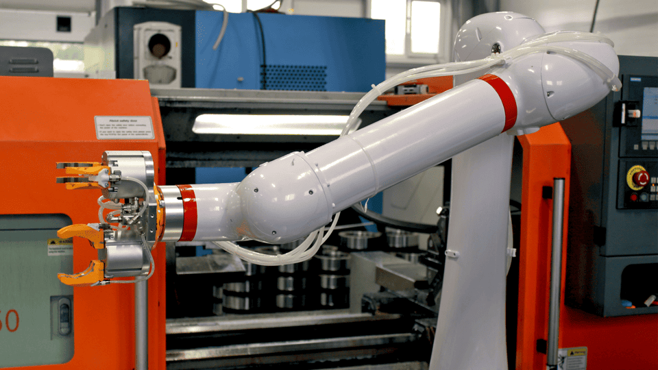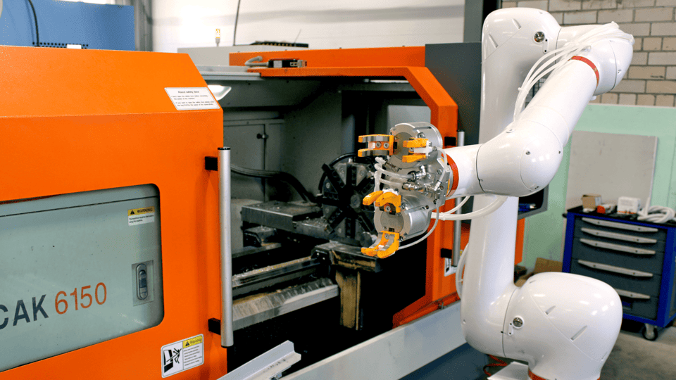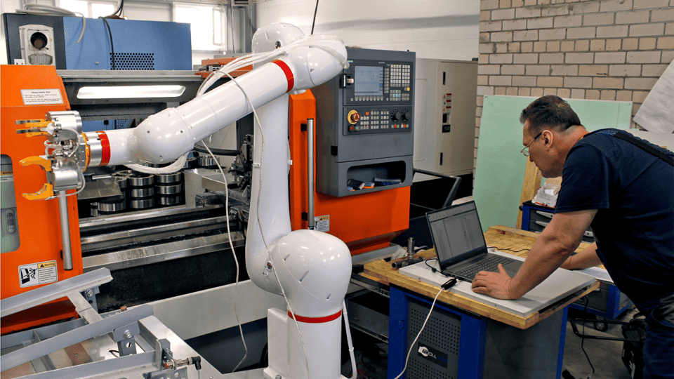 Особенностью проекта стала необходимость точной координации движений робота с операциями станка, включая установку заготовки, ее поворот на 180 градусов и снятие обработанной детали. Наши специалисты создали сложную программу управления, позволившую роботу двигаться точно и безопасно даже в условиях ограниченной площади цеха.