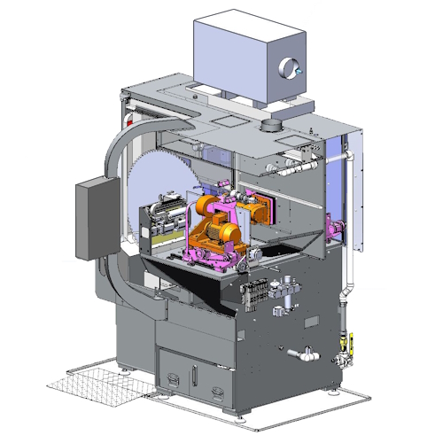 Заточка выполняется на скорости 5000 об/мин симметрично расположенными шпинделями. После обработки пильный диск перепозиционируется на следующий зуб.