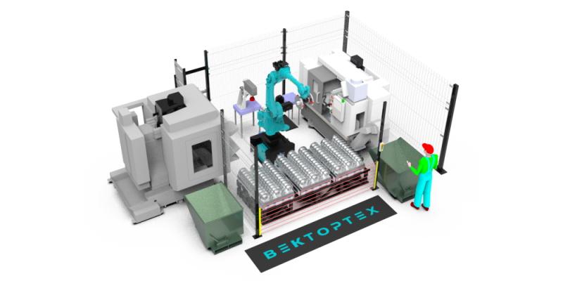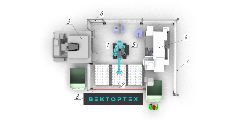 Состав комплекса:1 — Сварочный робот манипулятор 50кг грузоподъемности 2100мм досягаемости Данный комплекс предназначен для загрузки выгрузки токарно-фрезерной группы станков. Параллельное расположение позволяет получить замкнутый цикл выпуска изделий от заготовки до промаркированного изделия. Быстрая смена паллет позволяет не тратить время на дозагрузку, а привозить готовые паллеты сразу со склада. |