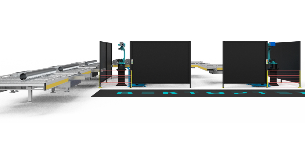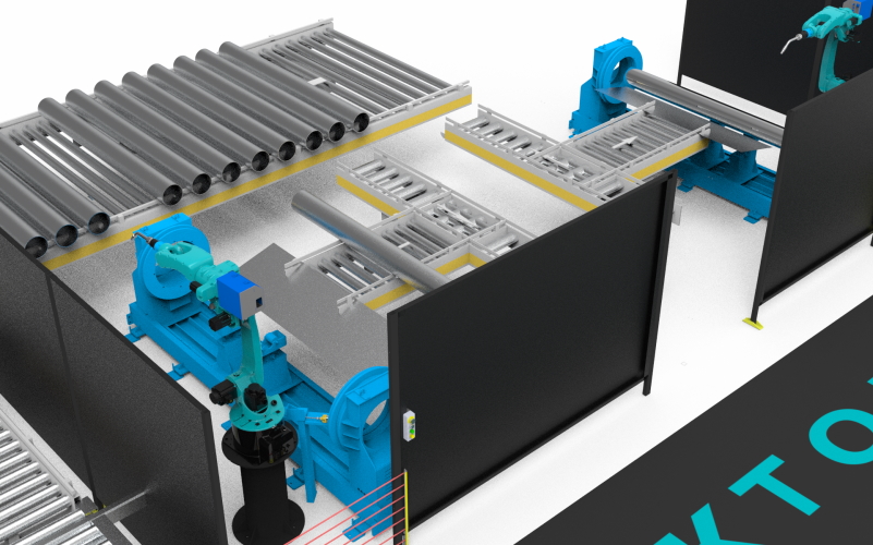 Данный комплекс способен сваривать закладные опоры длинной от 1500-2500 мм. Подача ребер жесткости автоматизирована, оператору необходимо лишь до загружать ребра жесткости в магазин. Роботы оснащены триангуляционными лазерными сканерами для корректировки положения шва. Роликовые опоры позволяют без усилий доставлять трубы операторам к зонам сварки, что позволяет минимизировать время простоя. Главный плюс данного комплекса полный цикл производства изделия от заготовки до готового продукта.