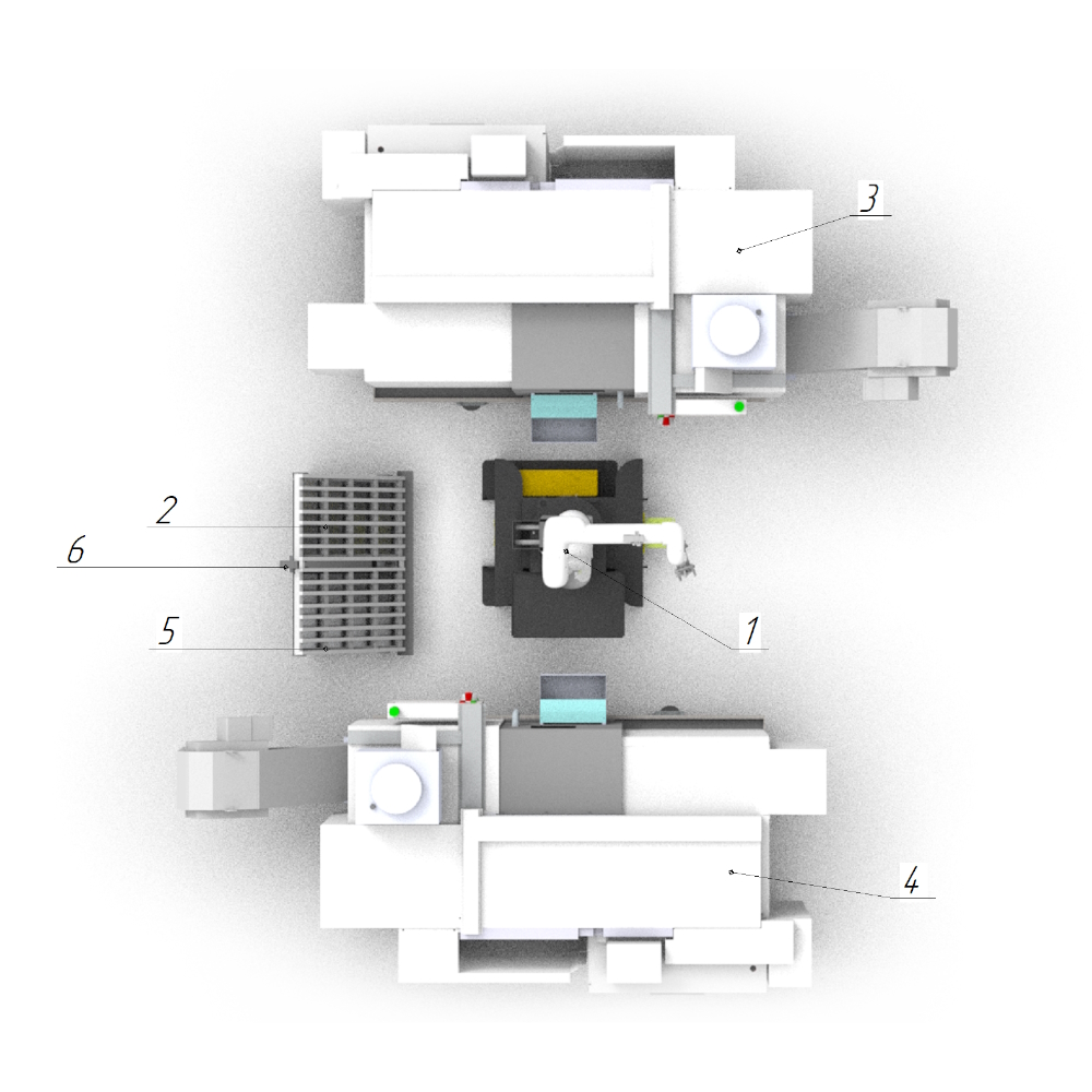 Загрузка/выгрзука ЧПУ и Фрезерного станка замкнутый цикл производства. (Параллельное расположение станков)