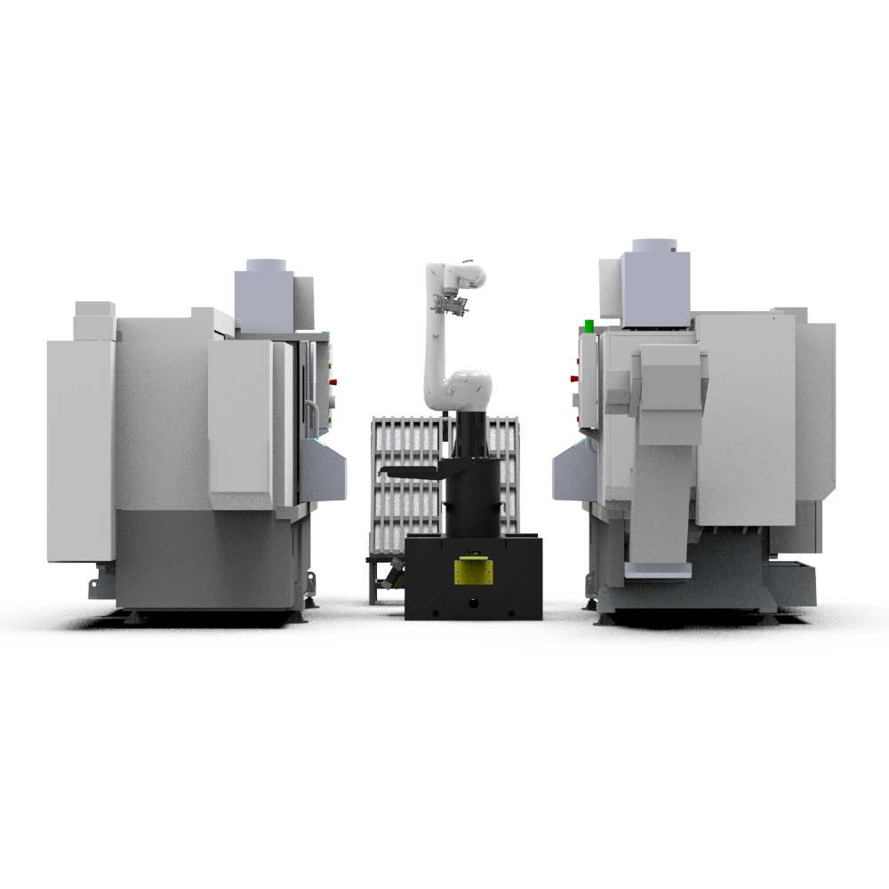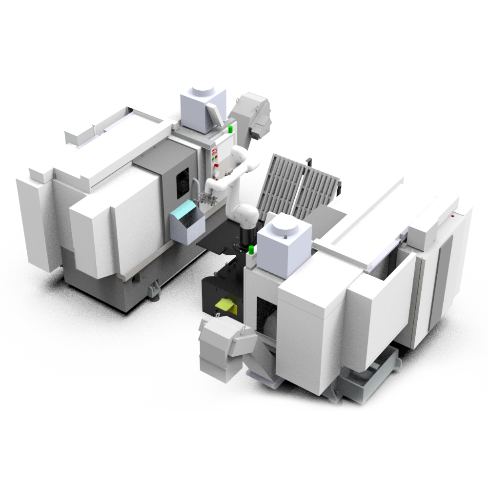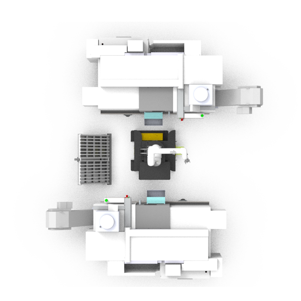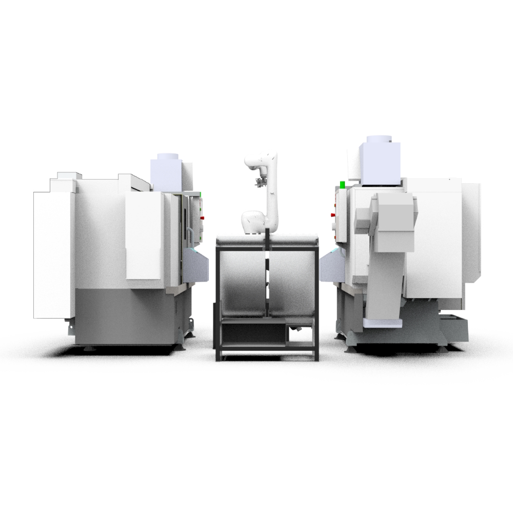Загрузка/выгрзука ЧПУ и Фрезерного станка замкнутый цикл производства. (Перпендикулярное расположение станков)